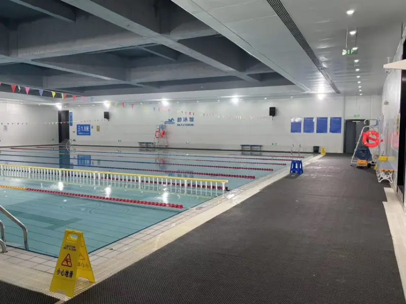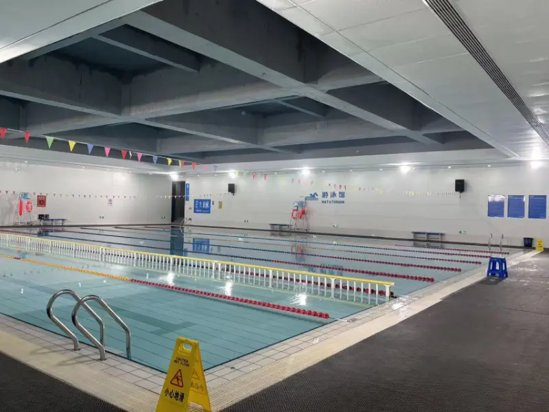 El exterior de la piscina presenta un sistema de paneles metálicos en forma de escamas de pez, que crean un efecto de luz y sombra en forma de escamas que cambia con la curvatura de la fachada y la dirección de la luz solar, mejorando el "flujo del agua". Toda la estructura del techo del área de la piscina cubierta está expuesta, con una viga que se extiende a lo largo de 48 metros, enfatizando la expresión explícita de la lógica estructural y reforzando la escala espacial y la sensación de poder del recinto deportivo. El recinto alberga dos piscinas: una piscina de competición y una piscina de entrenamiento. La piscina de competición tiene 50 metros de largo y 25 metros de ancho, con 8 calles; La piscina de entrenamiento tiene 50 metros de largo y 17 metros de ancho, con 6 calles. Ambas piscinas tienen 2 metros de profundidad.